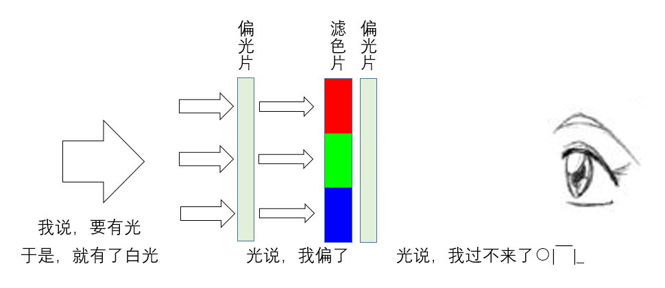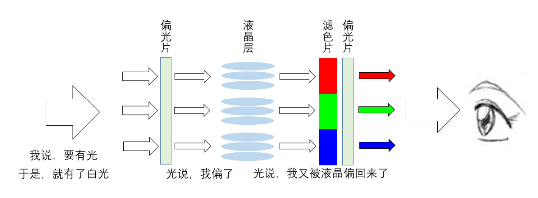 然后就用液晶来调整第一张偏光片后的偏正光方向,使其能够通过第二张偏光片。