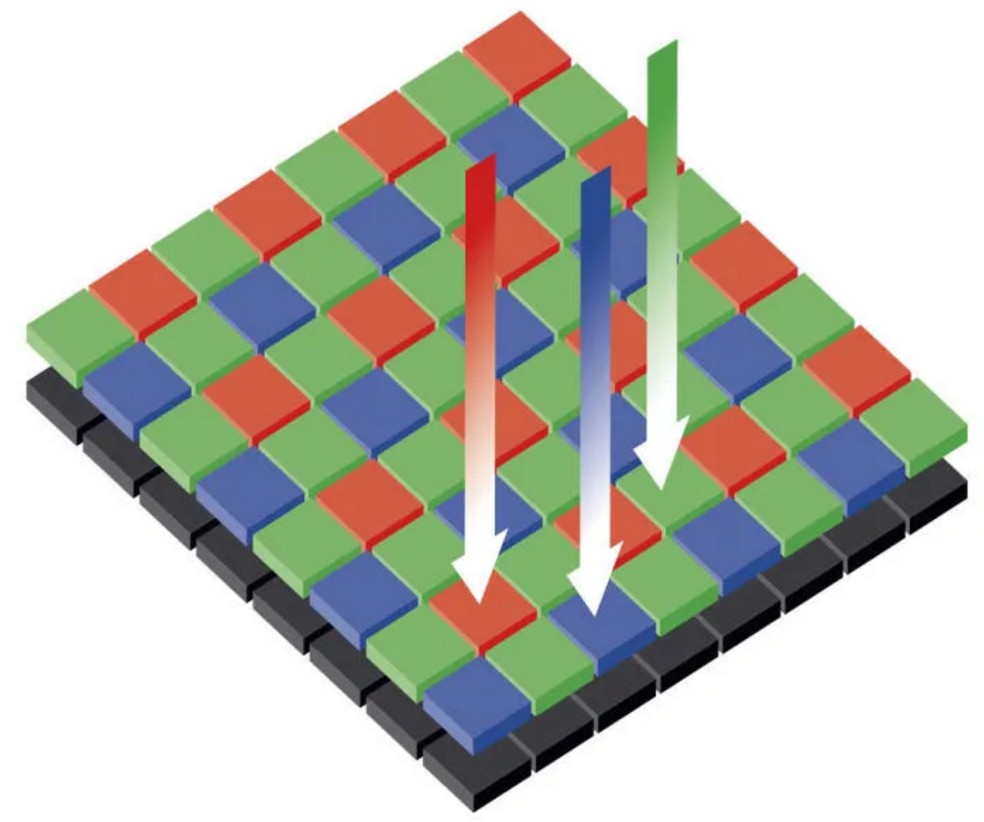 为了得到我们人眼所习惯的彩色图像,人们采用了两种方法:拜耳阵列(Bayer filter)方案和三种传感器叠加的方案。