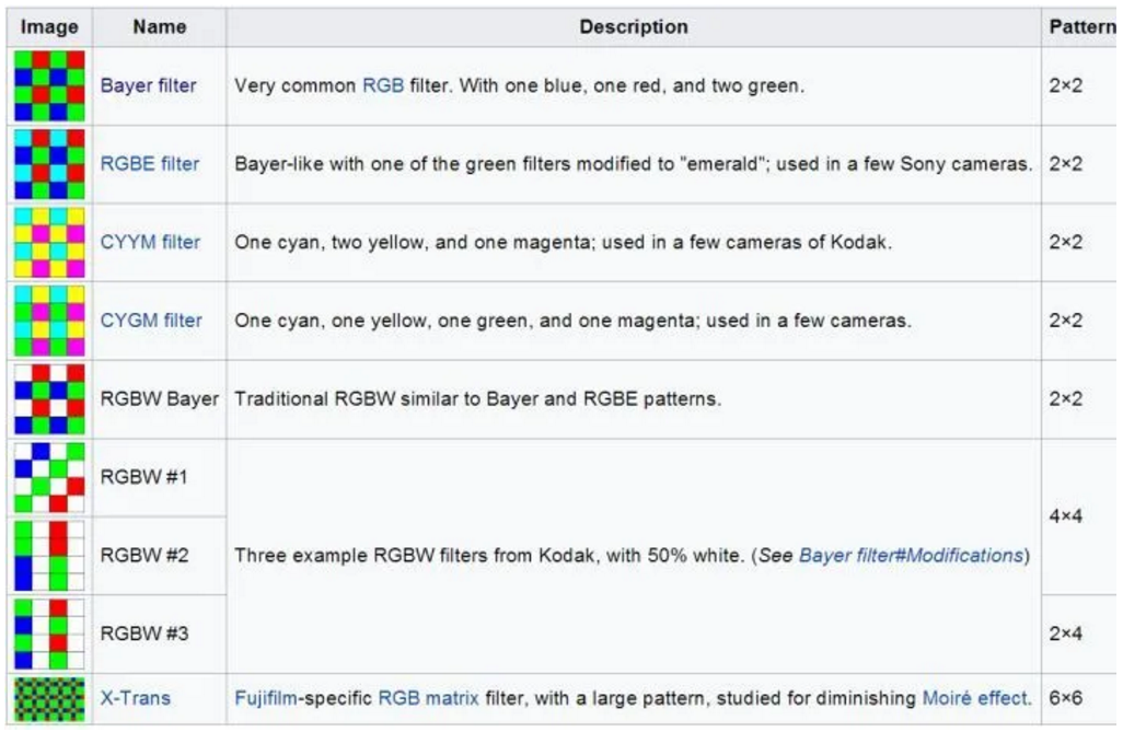 RGBE是用一个祖母绿的滤光片代替绿色;据说更接近人眼的感觉;CYYM是用青色、黄色、品红 1:2:1代替RGB;CYGM是青色、黄色、绿色、品红1:1:1:1;CYGM和CYYM这两种都是为了提高光通量,但牺牲了色彩准确度。简单解释下,比如品红=红+蓝,也就是只阻挡绿光;黄色=红+绿,只阻挡蓝光;青色=绿+蓝,只阻挡红光,相比RGB而言对白光的吸收变少了,可以提高光通量,代价是色彩不好确定。RGBW是用白色取代绿色,提高进光量,损失了一部分颜色信息。适合暗环境拍摄,降低噪点。RGBW#1~3是非马赛克方式的其他排列模式。X-Trans是为减小莫尔条纹的发生,采取不太规则的滤镜排列方式,且加大绿色感光面积,提高分辨率和色彩饱满度。