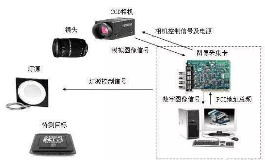 一个完整的机器视觉系统包括:照明光源、光学镜头、 CCD 摄相机、图像采集卡、图像检测软件、监视器、通讯单元等。