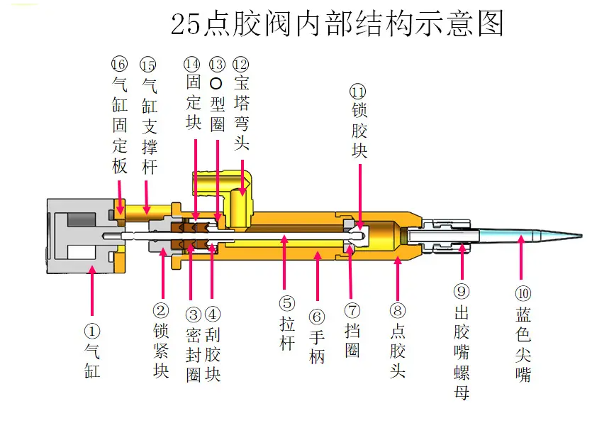 凝胶或硅胶等高粘稠流体点胶时,胶水容器通常是0.1加仑的卡筒或1至5加仑桶,桶装粘稠流体通过气动泵推动压盘,挤压胶水通过高压管供料到阀腔。