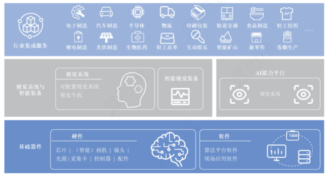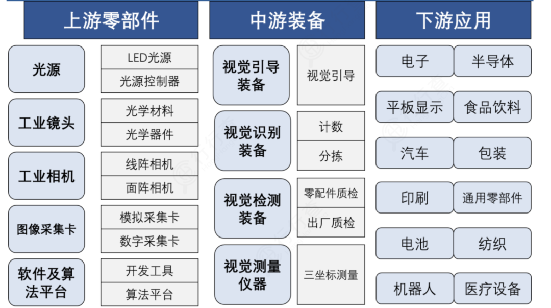 机器视觉可分为上游(硬件、算法软件)、中游(视觉系统、视觉装备集成)和下游终端应用。上游涉及的行业范围较为宽广,主要包括光源、工业镜头、工业相机、图像采集卡和软件及算法平台等环节;中游是机器视觉产业链最核心的环节,由视觉系统和视觉装备集成构成;下游为应用领域,广泛应用到电子、半导体、机器人、汽车、医疗等各行各业。