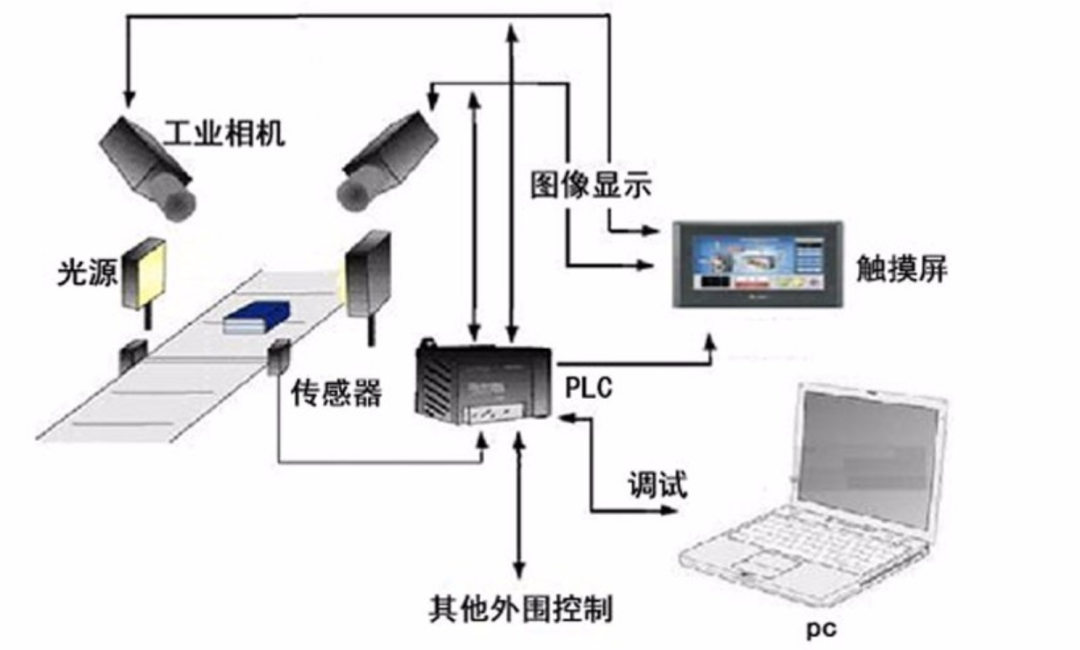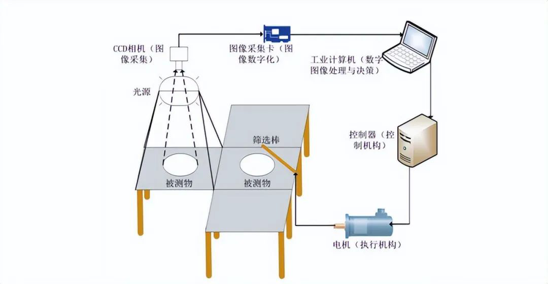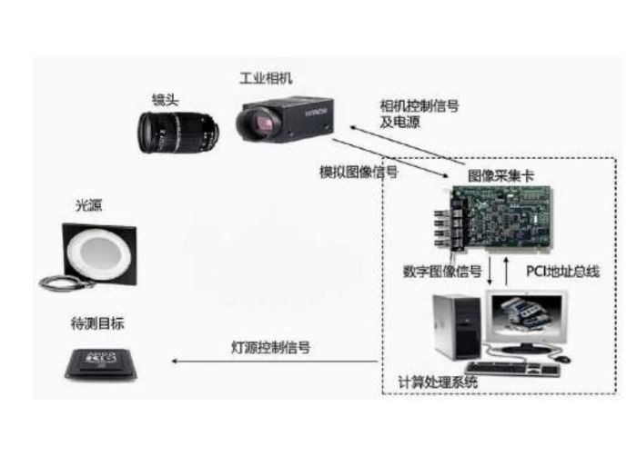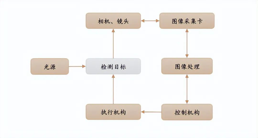 在一个典型的机器视觉系统中,光源及光源控制器、镜头、相机等硬件部分负责成像,视觉控制系统负责对成像结果进行处理分析、输出分析结果至智能设备的其他执行机构。机器视觉应用系统包括图像捕捉、光源系统、图像数字化模块、数字图像处理模块、智能判断决策模块和机械控制执行模块。