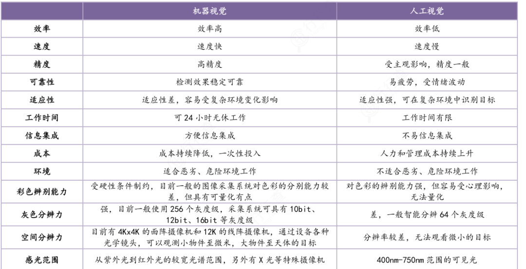 在工业领域,机器视觉相对人眼视觉存在显著优势。机器视觉拥有精度高、速度快、适应性强、可靠性高、效率高等人工视觉无法比拟的优势。在我国人工成本增加、数字化转型、制造业效率和质量要求提高的大背景下,正在逐步替代人工。