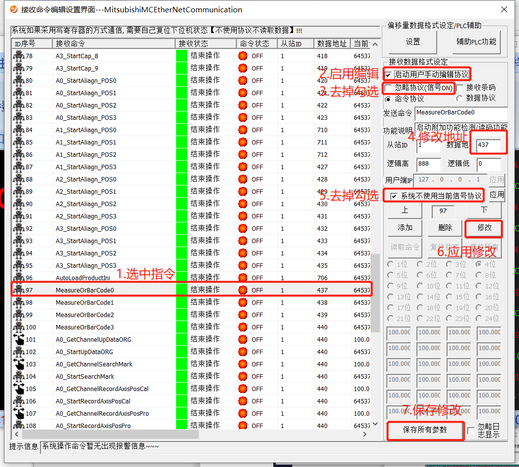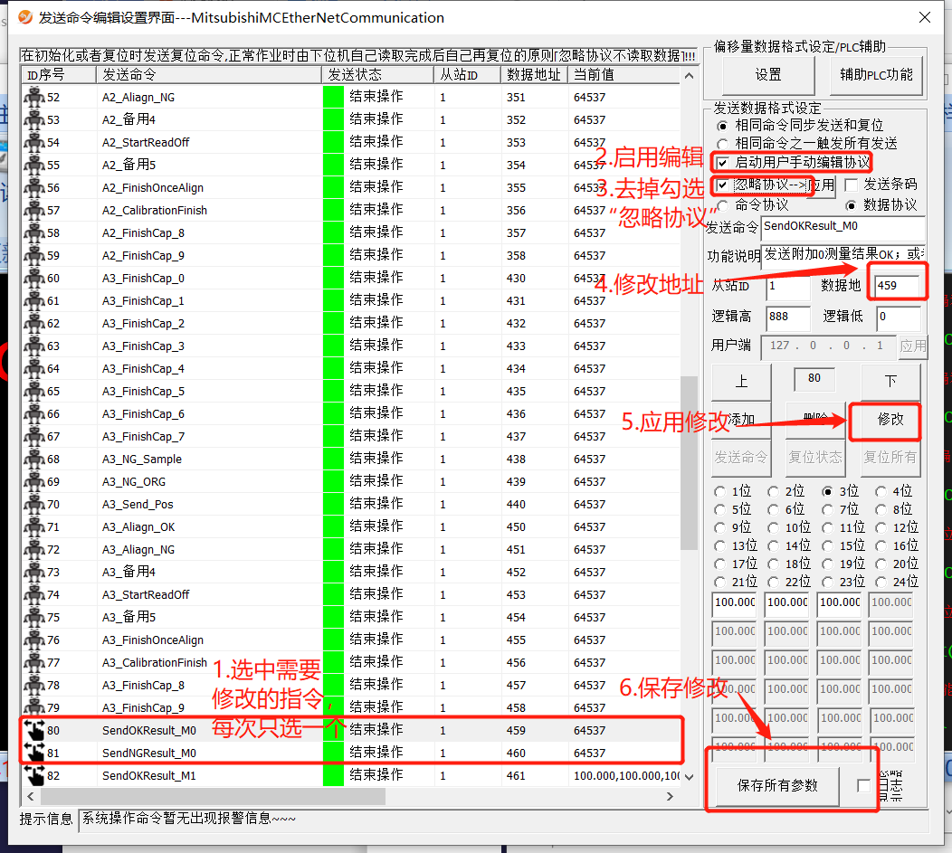 依次修改发送命令里的80/81指令参数,所有命令修改完后将去掉勾选。