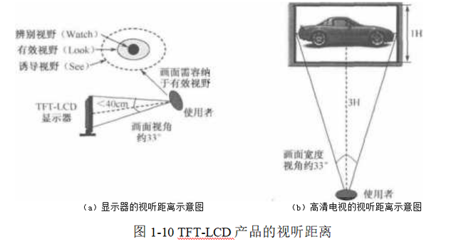 (8) 视听距离:在不同的应用领域,TFT-LCD使用者的心态也是不一样的。如图l-10(a)所示,用做电脑显示器时,使用者身体前倾主动地找内容,人眼与显示器的距离在40cm左右比较合适。为了让显示器的画面完全容纳于使用者30°36°的视野范围以内,TFT-LCD的尺寸不能过大,一般在30寸以下为宜。电脑显示器一般用做细小的文字编辑处理,TFT-LCD的像素节距最好在0. 3mm以下。如图l-10(b)所示,TFT-LCD用作电视,使用者身体后仰被动地欣赏内容,最佳的视听距离要同时保证观赏到的画面品质和身临其境的感觉;视听距离太 近,画面看起来粗糙,会造成眼疲劳。视听距离太远,会缺少身临其境的感觉。一般,标清电视