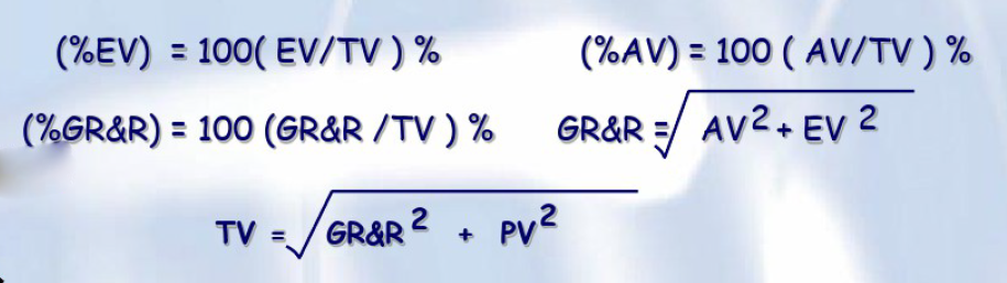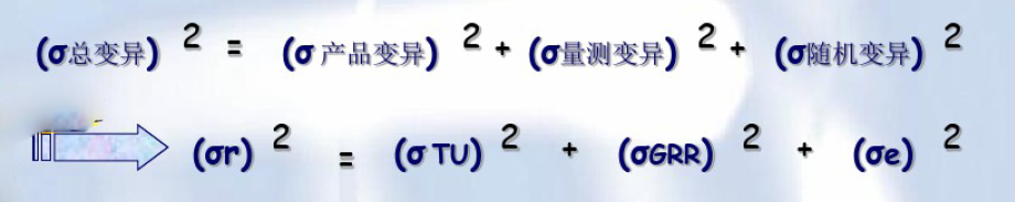 我们知道同一产品在温度/湿度等等环境下本身特性上会发生一些变异,量测的仪器/工具也会发生变异,还有其他的一些随机的变异;而这些变异就会产生数据上的误差;那么我们可以理解:看到的数据误差(σr)可包含产品误差(σTU)、仪器量测误差(σ GRR)、其他随机误差(σe)三个部分。
