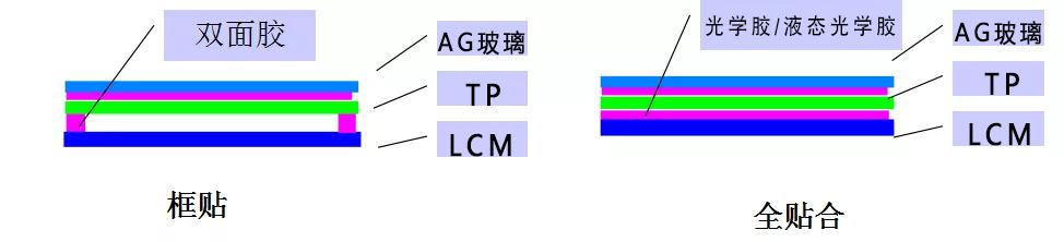 又称为口字胶贴合,即简单的以双面胶将触摸屏与显示屏的四边粘起来,两块屏中间是空的,有空气。