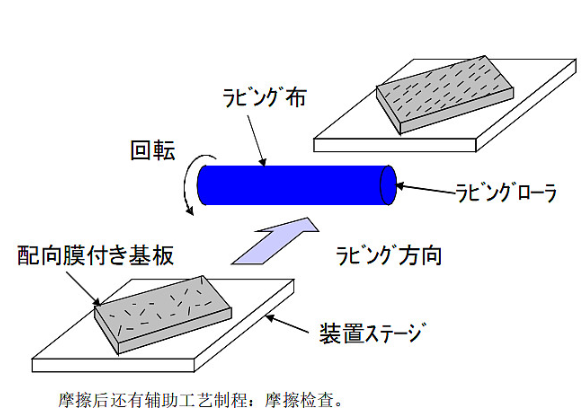 摩擦的作用是用绒布在PI 上摩过,将PI 的侧链梳理到一个方向。示意图如下: