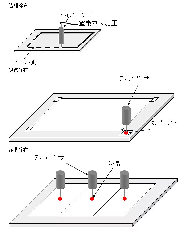 边框料的作用有三:一是将CF 与TFT 基板粘结在一起;二是将盒厚固定下来;三是将液晶限制在盒内。银点料的作用是导通 CF 和TFT 上的Common 电极。对ODF 工艺而言,边框料和银点料必须是采用快速固化的 UV 固化胶。液晶(Liquid Crystal)的作用是改变盒的光学状态。这三种材料的涂布都是采用一种叫Dispensor 的涂布头来完成的。其示意图分别如下:
