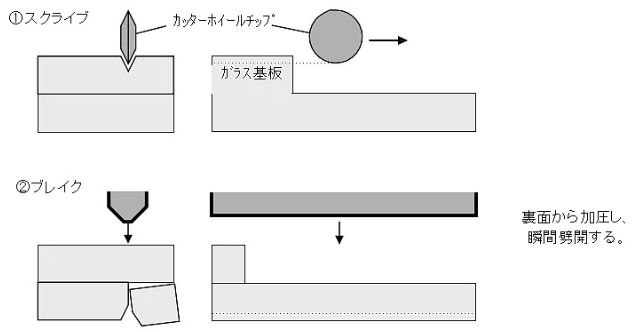 在产品盒制作完成后,需要将这些排列在一起的盒分割成独立的屏。这个过程就称为切割。切割是通过金刚刀轮在玻璃表面滑过来完成的。其原理图如下: