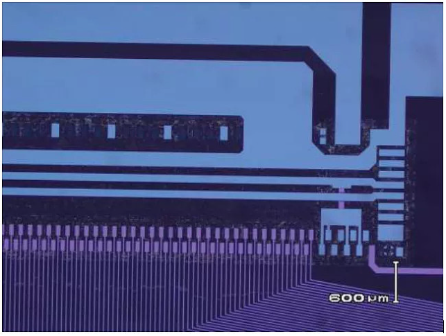 COG(Chip on Glass)和 FPC (Flexible Printed Circuit)是一种电路的连接方式。由于电极多,一对一的排线连接很困难。现在通常的做法是将玻璃上的引线作成阵列,IC/FPC上的引线也作成对应阵列,通过一种各向异性导电膜(ACF)将IC/FPC上的电极与玻璃上的电极一对一连接导通。玻璃上的引线电极阵列示意图如下: