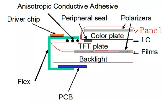 邦定后IC/FPC、屏、及 ACF 的相对位置如下图:
