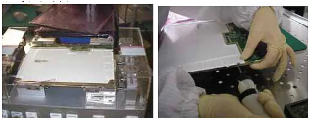 组装是将背光源、屏、控制电路板、及触摸屏等部件组合在一起,形成一个完整的显示模块。组装一般是由手工来完成的,熟练的技术工人在这里非常重要。见下图: