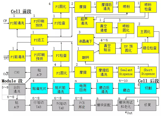 模块段除去以上主要工艺制程外,还有一些辅助的工艺制程,如:激光切线,切线后电测,邦定后电测,组装后电测,切线后显微镜检查,绑定后显微镜检查或自动光学检查,IC 邦定后剪切力剥离测试,FPC 邦定后拉力剥离测试,组装后加电老化,包装出货等。