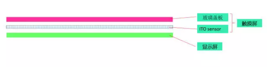 G+F贴合技术的外部是玻璃盖板,中间的传感器为一层薄膜(Film),这层薄膜其实是ITO sensor(ITO就是氧化铟锡,一种透明导电材料,ITO按照特定的图案,涂在玻璃或者塑料薄膜上,然后贴在一层厚的保护玻璃上,就是ITO sensor);一层Film只能实现单点触摸,G+FF表示2层Film,因为Pet(塑料物质)不能像玻璃那样2面做线路,需要2层Film才可以实现多点触控。