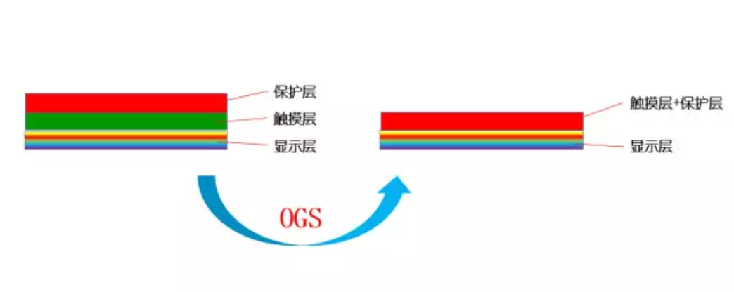 OGS技术就是把触控屏与保护玻璃集成在一起,在保护玻璃内侧镀上ITO(氧化铟锡,一种透明导电材料)导电层,直接在保护玻璃上进行镀膜和光刻,由于节省了一片玻璃和一次贴合,触摸屏能够做的更薄且成本更低。市面上大部分手机都是采用OGS贴合技术。