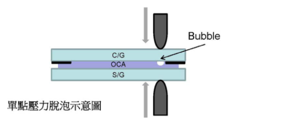 一次脱泡后留下的小气泡很难再次脱掉,因为气泡缩小了而相对面积下的OCA变大了,行成围墙效应,也就是说压力无法有效传递到小面积的气泡上,导致无法脱泡完成,可以使用单点压力脱泡的来解决这个问题
