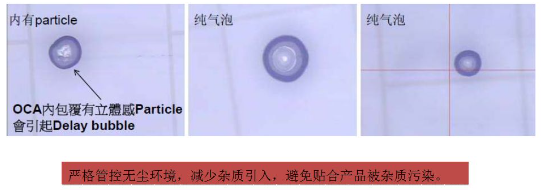 3.确定故障气泡是空气引起还是杂质引起,杂质引起的气泡里面有立体杂质。杂质气泡需要管理好无尘车间,特别是来料产品上的杂质被带到车间和贴合部件上。