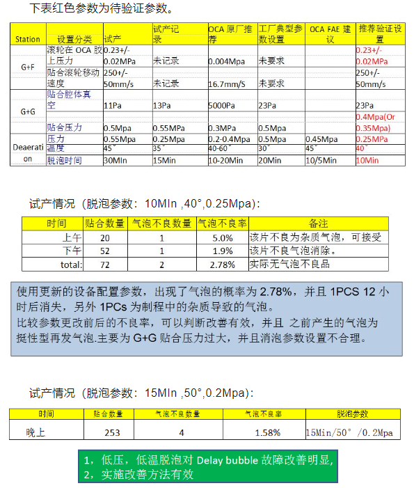 汇总收集到的生产工艺设置参数,根据脱泡失效原理中各参数的影响,针对滚轮压力,贴合压力,脱泡压力,脱泡温度,脱泡时间重新设置参数,考虑到目前的气泡反弹现象,将与产品变形相关的参数调整到最小。