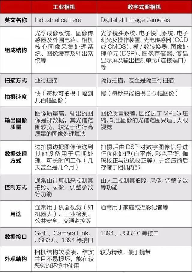 工业相机的图像传感器是逐行扫描的,而普通相机的图像传感器是隔行扫描的,逐行扫描的图像传感器生产工艺比较复杂,成品率低,出货量少且价格昂贵。