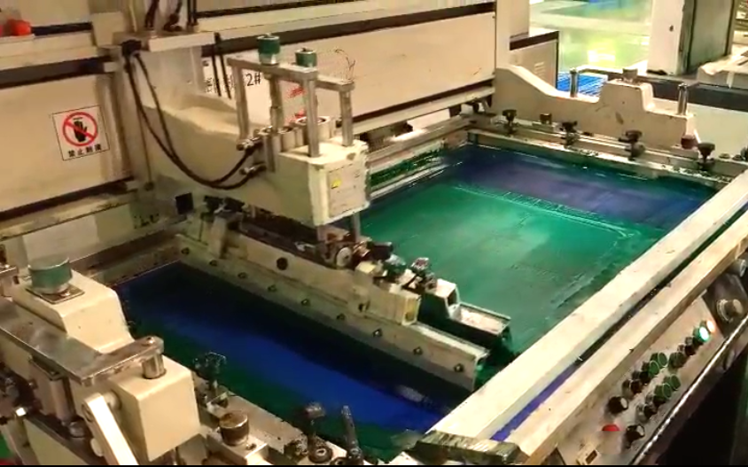 通过丝网印刷或喷涂的方式将油墨覆盖到整个板面上。以下图片展示的是丝印油墨的过程。