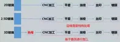 玻璃一般分为2D,2.5D及3D玻璃,2D和2.5D玻璃防护屏产品的生产方法是将玻璃基板进行切割,通过精雕、光孔、抛光、强化、丝印、镀膜等加工后,制成各种规格型号的产品。3D曲面玻璃的生产流程与2D和2.5D产品基本相同,最大区别在于新增热弯成型设备。