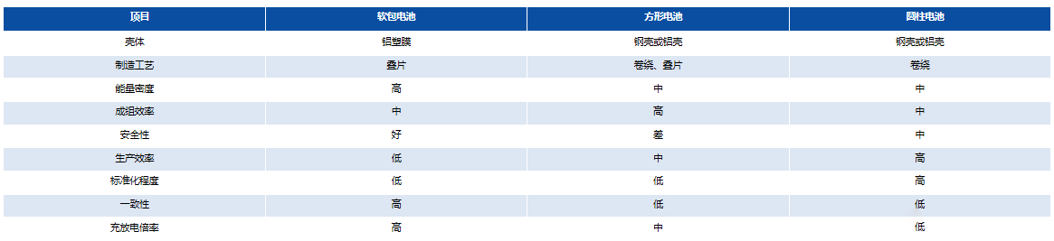 软包电池在同容量下重量最轻,定制化程度高,界面均一性好,快充性能好。但铝塑膜依赖进口,生产成本高,行业内的生产标准并未统一,电池一致性较差。主流软包电池采用叠片工艺。