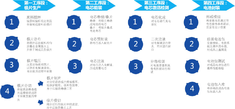 锂电池的生产共分为四大工序,分别对应极片生产、电芯组装、电芯激活检测和电池封装。