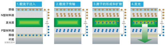 OLED(Organic Light Emitting Display,有机发光显示器)是指有机半导体材料在电场驱动下,通过载流子注入和复合导致发光的现象。其基本原理是用ITO(Indium tin oxide,氧化铟锡)透明电极和金属电极分别作为器件的阳极和阴极,在一定电压驱动下,让电子和空穴分别从阴极和阳极注入到电子和空穴传输层,电子和空穴分别经过电子和空穴传输层迁移到发光层,并在发光层中相遇,电子进入空洞时,会以光的形式释放出多余的能量。