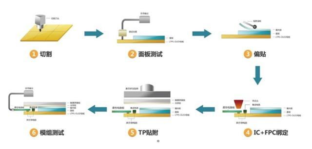 模组段工艺将封装完毕的面板切割成实际产品大小,之后再进行偏光片贴附、控制线路与芯片贴合等各项工艺,并进行老化测试以及产品包装,最终呈现为客户手中的产品。