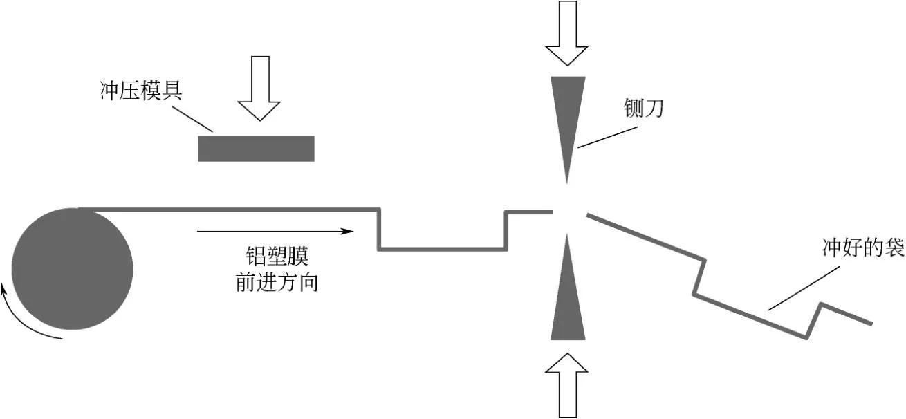 铝塑膜成型工序是软包电池生产的特殊工艺,软包电芯可以根据客户的需求设计成不同的尺寸,当外形尺寸设计好后,就需要开发相应的模具,使铝塑膜成型。成型工序也叫作冲坑,顾名思义,就是用成型模具在加热的情况下,在铝塑膜上冲出一个能够装卷芯的坑。图3为冲坑示意图。