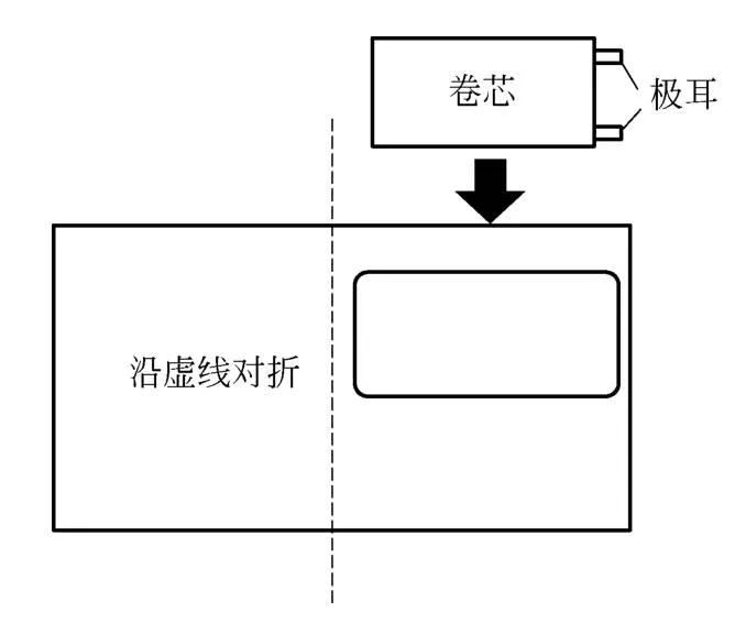 顶侧封工序是软包锂离子电芯的第一道封装工序。顶侧封实际包含了两个工序,顶封与侧封。首先要把卷绕好的卷芯放到冲好的坑里,然后沿虚线位置将包装膜对折,图4为顶侧封示意图。