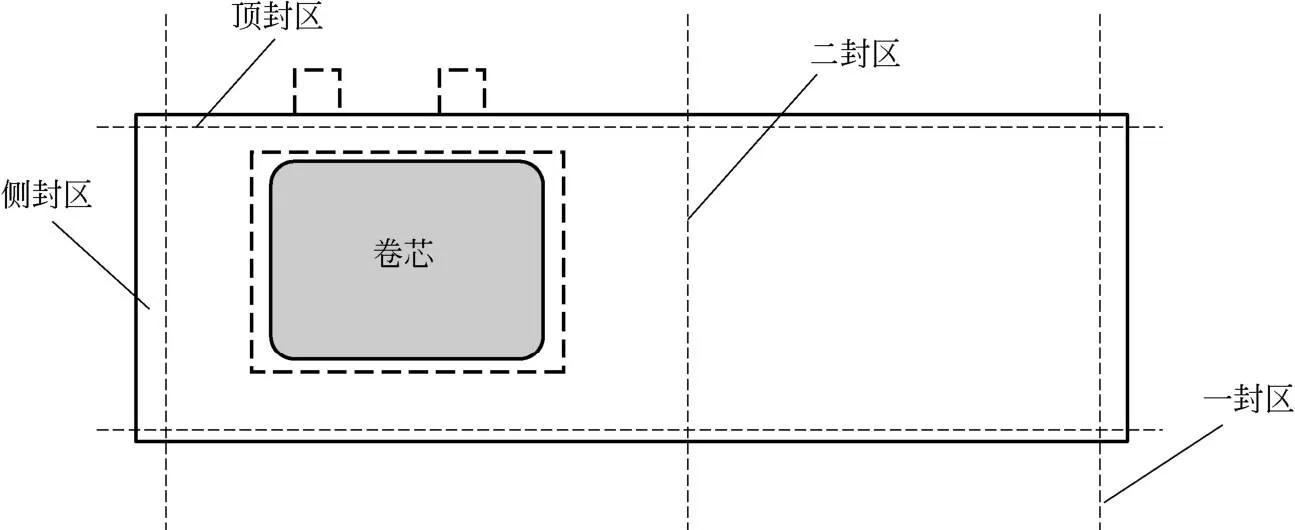 铝塑膜装入卷芯后,需要封装的几个位置,包括顶封区、侧封区、一封区与二封区。图5为封装位置示意图。
