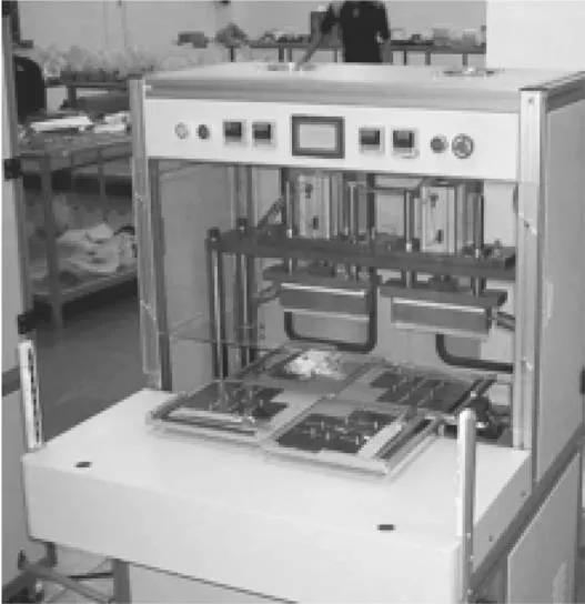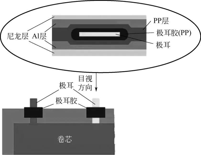 把卷芯放到坑中之后,就把整个铝塑膜放到夹具中,在顶侧封机里进行顶封与侧封。图6为顶侧封机,这种型号的顶侧封机带四个夹具,左边那个工位是顶封,右边那个工位是侧封。两块金属上封头的下面还有一个下封头,封装的时候两个封头带有一定的温度(一般在180℃左右),合拢时压在铝塑膜上,铝塑膜的PP层就熔化然后黏结在一起了,这样就封装完成了。顶封是要封住极耳的,极耳是金属(正极铝,负极镍),怎么跟PP封装到一起呢?这就要靠极耳上的一个小部件——极耳胶来完成了。封装时,极耳胶中的PP与铝塑膜的PP层熔化黏结,形成了有效的封装结构。图7为封装结构示意图。
