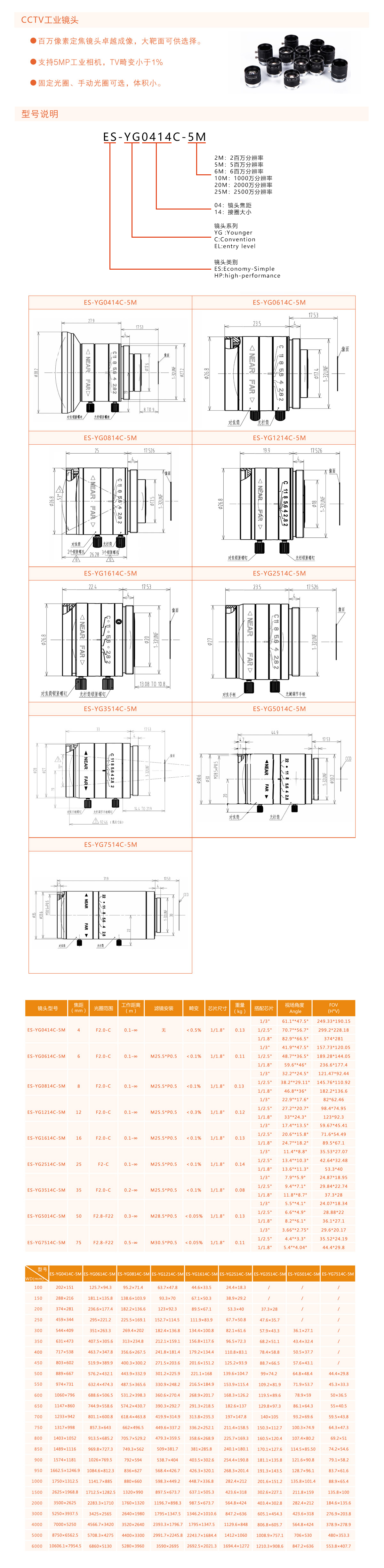 ES-YG-5M镜头系列视野范围和工作距离关系