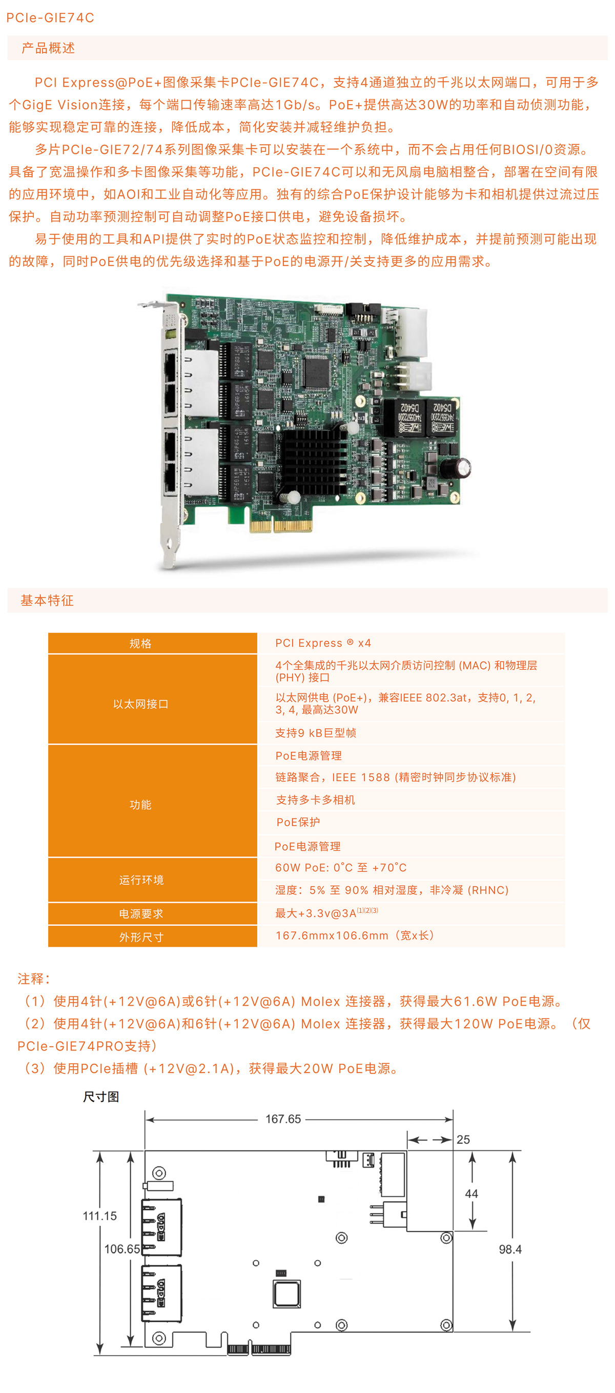 PCI Express@PoE+图像采集卡PCle-GIE74C,支持4通道独立的千兆以太网端口,可用于多个GigE Vision连接,每个端口传输速率高达1Gb/s。PoE+提供高达30W的功率和自动侦测功能,能够实现稳定可靠的连接,降低成本,简化安装并减轻维护负担。