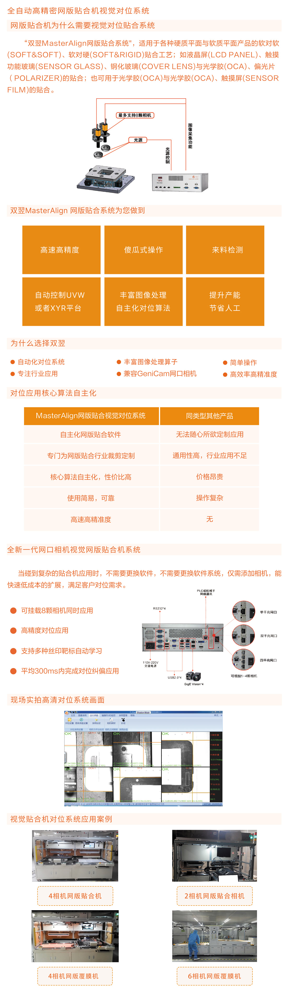 “杏耀平台登录入口MasterAlign网版贴合系统",适用于各种硬质平面与软质平面产品的软对软(SOFT&SOFT)、软对硬(SOFT&RIGID)贴合工艺;如液晶屏(LCDPANEL)、触摸功能玻璃(SENSOR GLASS)、钢化玻璃(COVERLENS)与光学胶(OCA)、偏光片(POLARIZER)的贴合;也可用于光学胶(OCA)与光学胶(OCA)、触摸屏(SENSOR FILM)的贴合。
