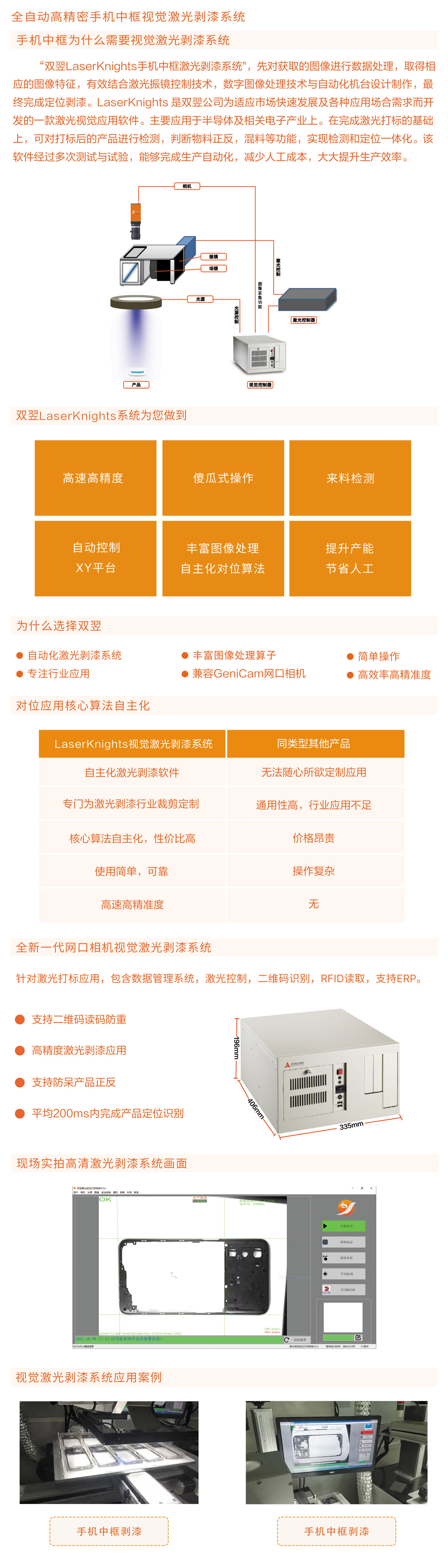 “杏耀平台登录入口LaserKnights手机中框激光剥漆系统",先对获取的图像进行数据处理,取得相应的图像特征,有效结合激光振镜控制技术,数字图像处理技术与自动化机台设计制作,最终完成定位剥漆。LaserKnights是杏耀平台登录入口公司为适应市场快速发展及各种应用场合需求而开发的一款激光视觉应用软件。主要应用于半导体及相关电子产业上。在完成激光打标的基础上,可对打标后的产品进行检测,判断物料正反,混料等功能,实现检测和定位一体化。该软件经过多次测试与试验,能够完成生产自动化,减少人工成本,大大提升生产效率。
