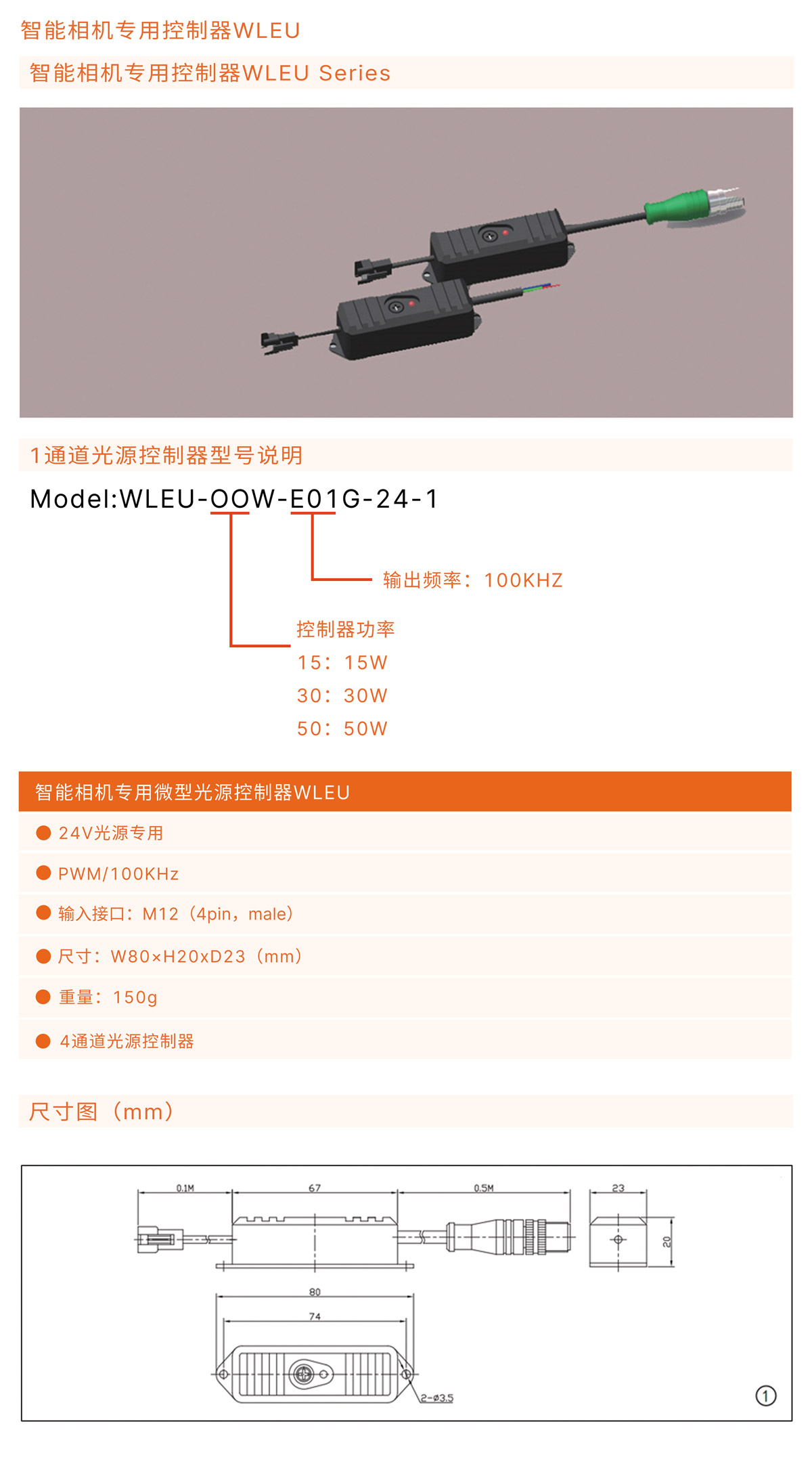 智能相机专用微型光源控制器:24V光源专用,PWM/100KHz,输入接口:M12,4通道光源控制器。