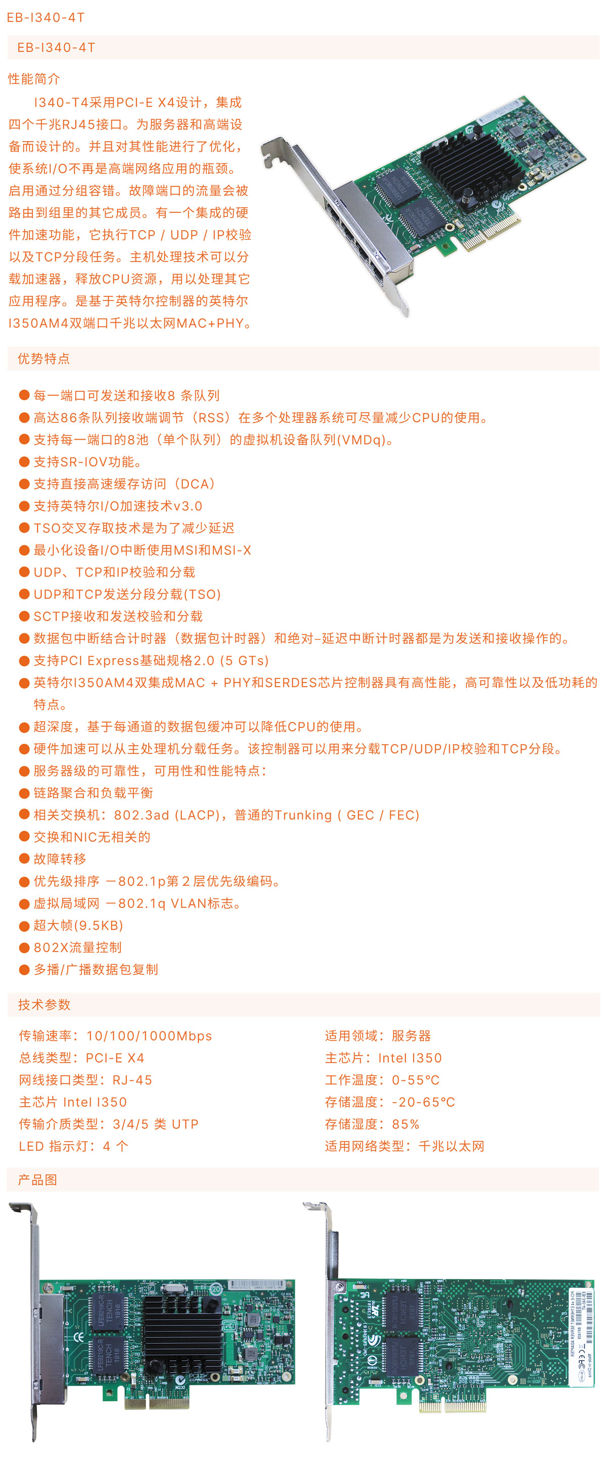 图像采集卡-EB-I340-4T的性能简介,I340-4T采用PCI-EX4设计,为服务器合高端设备而设计的。主要适用领域为服务器,主芯片式Intel I350。