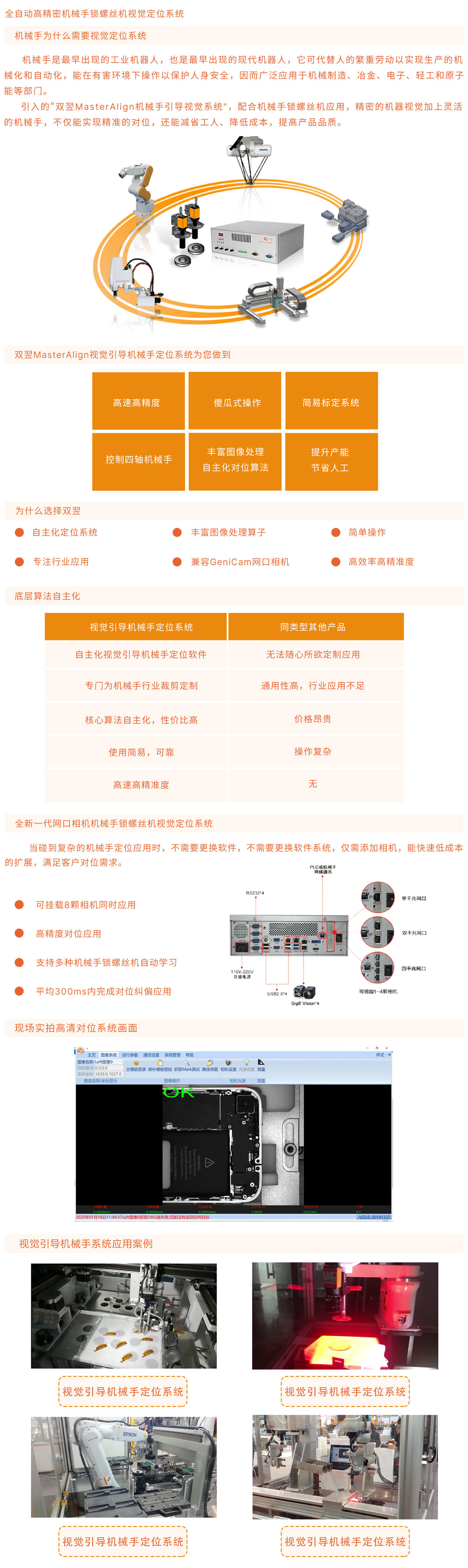 引入的“杏耀平台登录入口MasterAlign机械手引导视觉系统",配合机械手锁螺丝机应用,精密的机器视觉加上灵活的机械手,不仅能实现精准的对位,还能减省工人、降低成本,提高产品品质。
