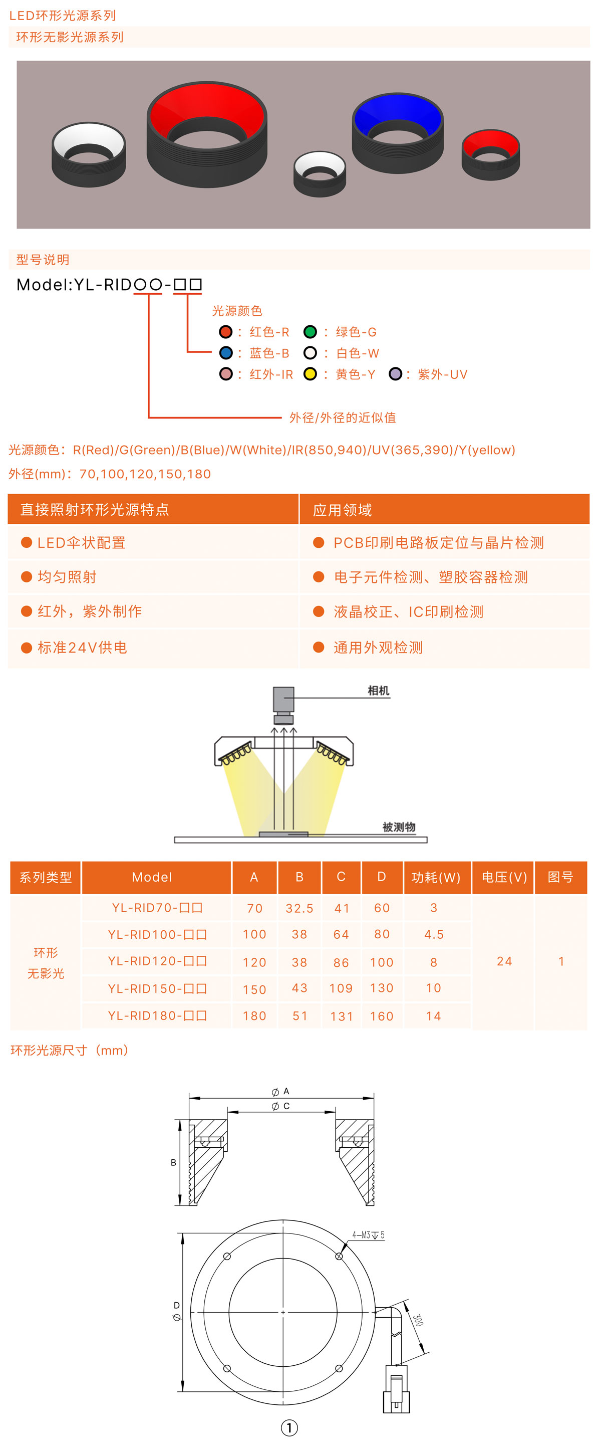 环形无影光源的特点:LED伞状配置,均匀照射,红外,紫外制作,标准24V供电。