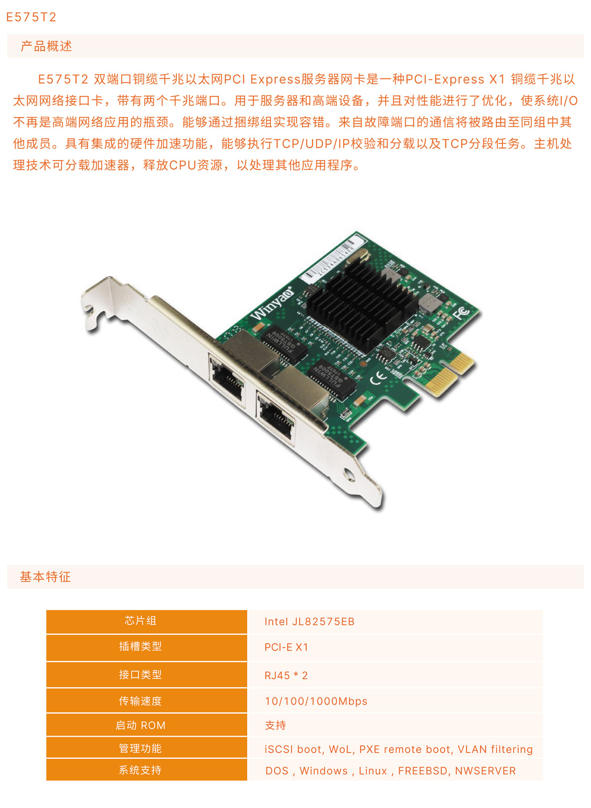 E575T2 双端口铜缆千兆以太网PCI Express服务器网卡是一种PCI-Express X1 铜缆千兆以太网网络接口卡,带有两个千兆端口。用于服务器和高端设备,并且对性能进行了优化,使系统I/O不再是高端网络应用的瓶颈。能够通过捆绑组实现容错。来自故障端口的通信将被路由至同组中其他成员。具有集成的硬件加速功能,能够执行TCP/UDP/IP校验和分载以及TCP分段任务。主机处理技术可分载加速器,释放CPU资源,以处理其他应用程序。