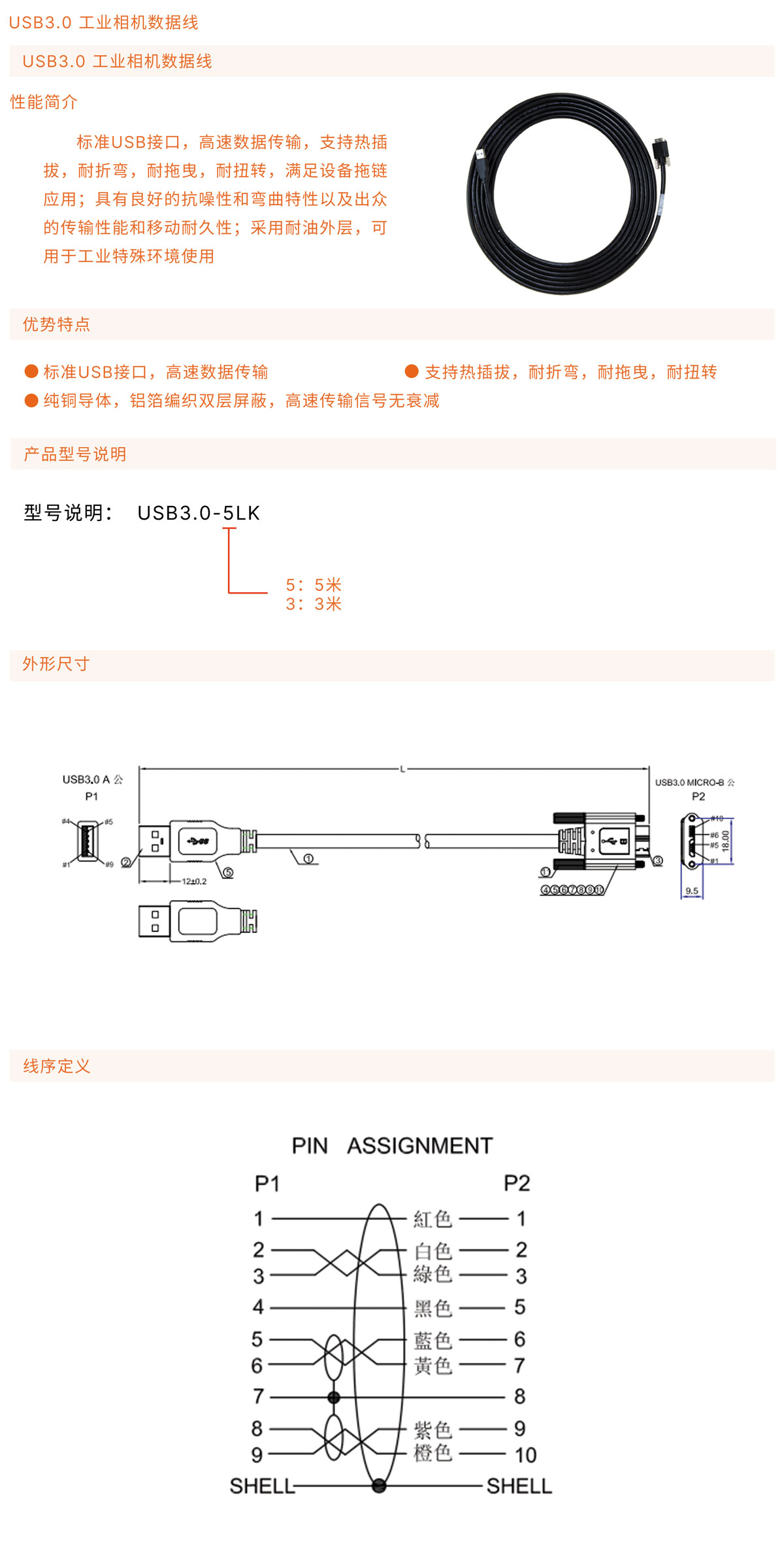 标准USB接口,高速数据传输,支持热插拔,耐折弯,耐拖曳,耐扭转;具有良好的抗噪性和弯曲特性以及出众的传输性能和移动耐久性 ;纯铜导体,铝箔编织双层屏蔽,高速传输信号无衰减;采用耐油外层,可用于工业特殊环境使用;