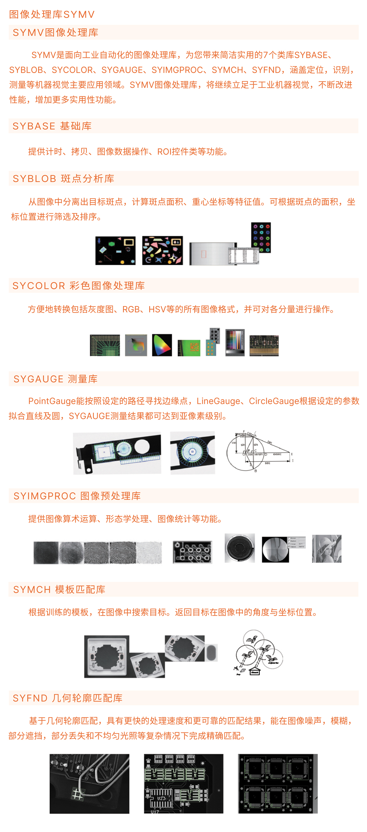 SYMV是面向工业自动化的图像处理库,为您带来简洁实用的7个类库SYBASE、SYBLOB、SYCOLOR、SYGAUGE、SYIMGPROC、SYMCH、SYFND,涵盖定位,识别,测量等机器视觉主要应用领域。SYMV图像处理库,将继续立足于工业机器视觉,不断改进性能,增加更多实用性功能。