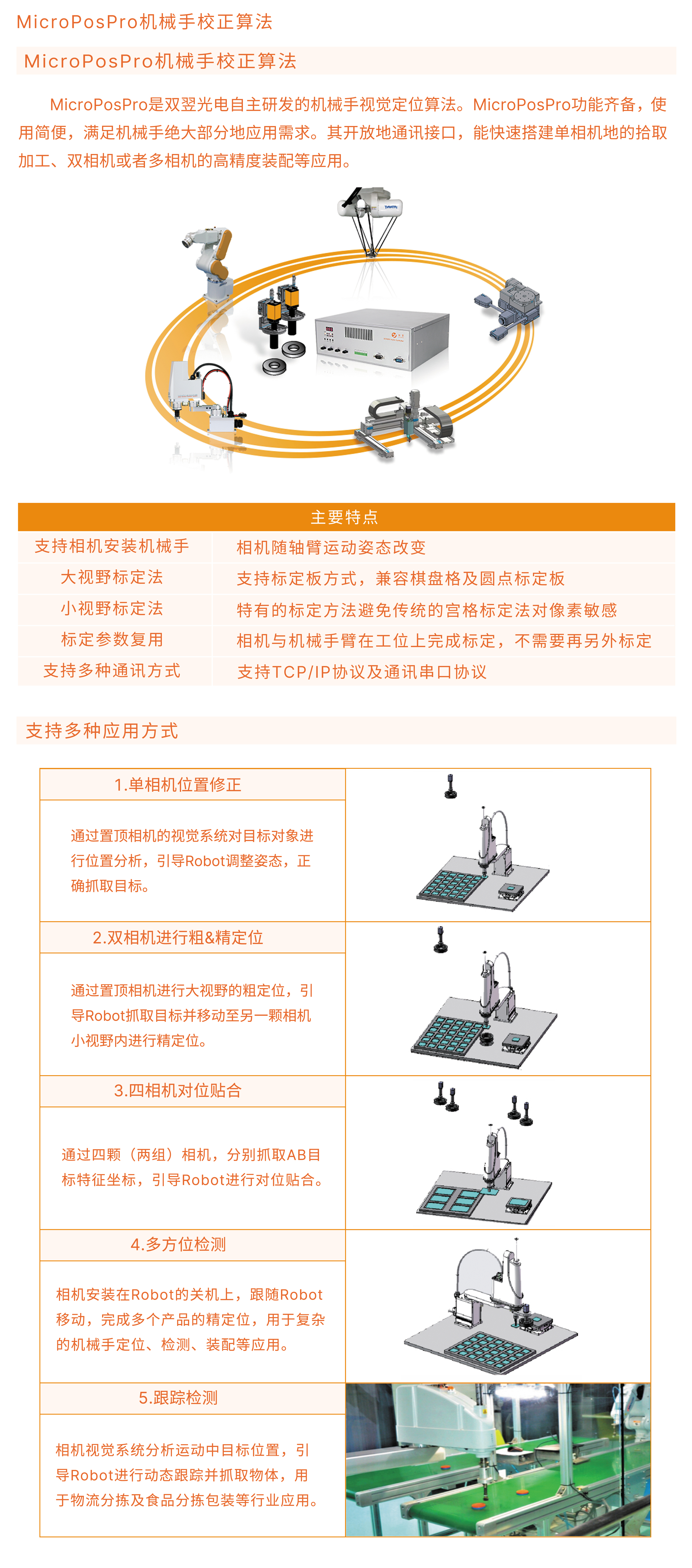 机械手校正算法,MicroPosPro是双翌光电自主研发的机械手校正算法,MicroPos功能齐备,使用简便,满足机械手绝大部分地应用需求。其开放地通讯接口,能快速搭建单相机地的拾取加工、双相机或者多相机的高精度装配等应用。