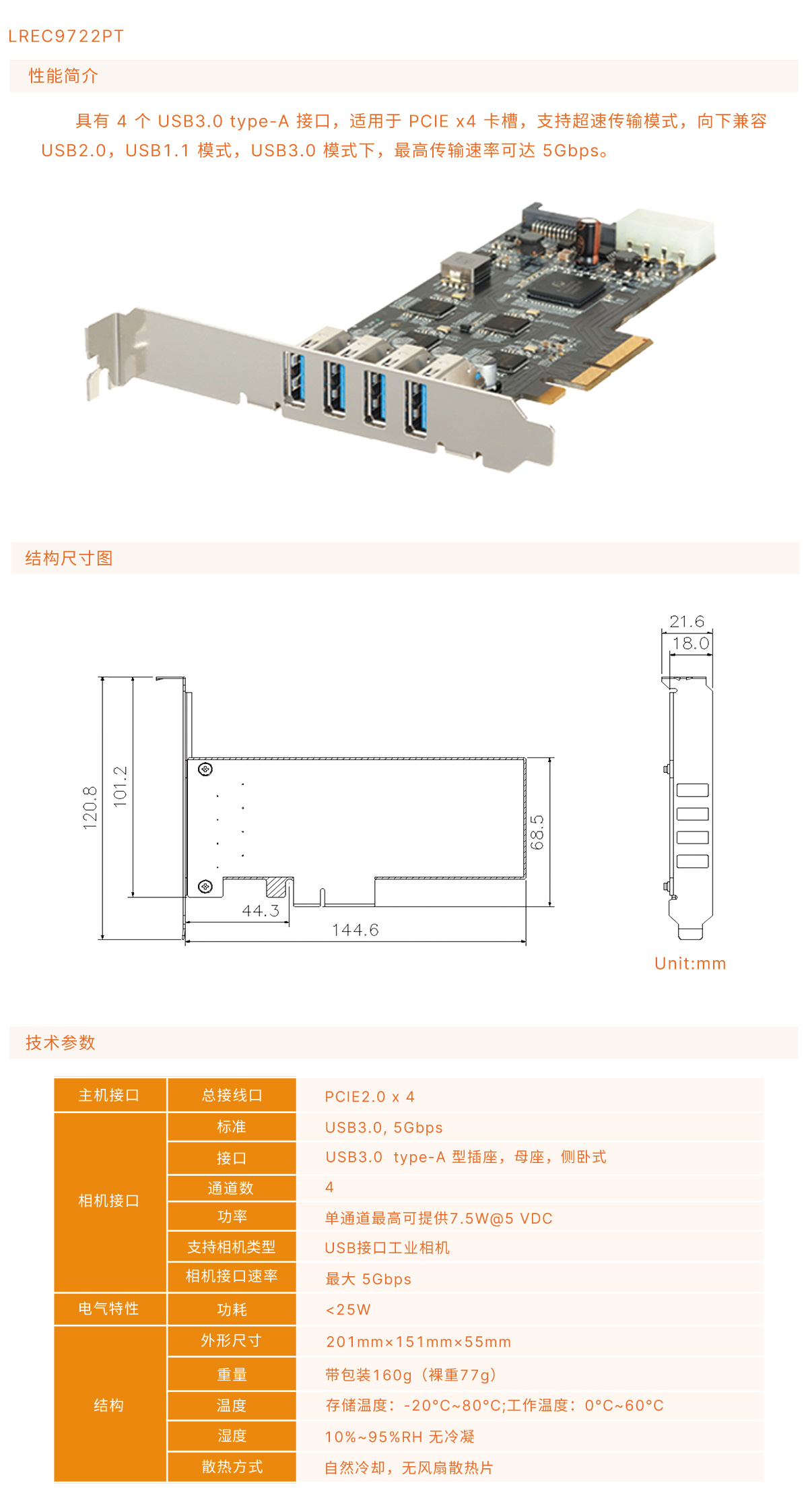 具有 4 个 USB3.0 type-A 接口,适用于 PCIE x4 卡槽,支持超速传输模式,向下兼容 USB2.0,USB1.1 模式,USB3.0 模式下,最高传输速率可达 5Gbps。