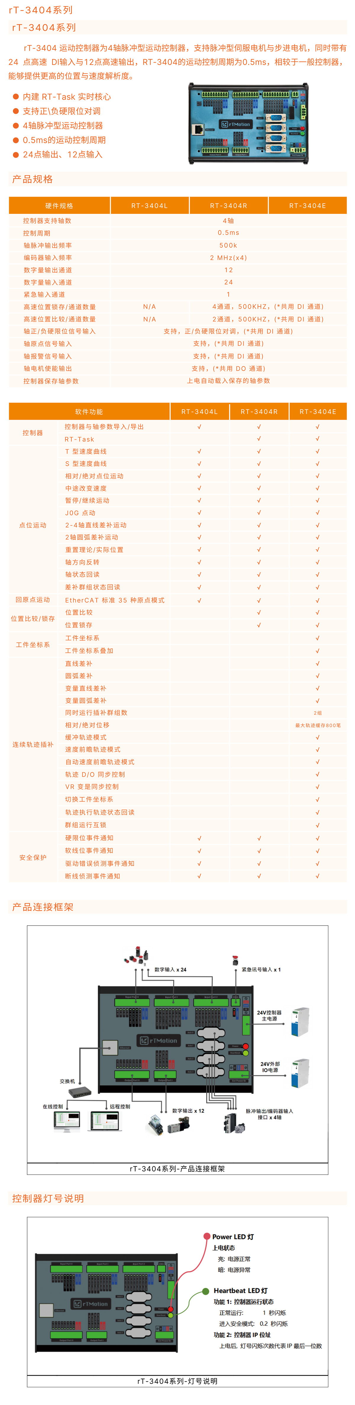 RT-3404 运动控制器为 4轴脉冲型运动控制器,支持脉冲型伺服电机与步进电机,同时带有 24 点高速 DI输入与 12 点高速输出.,RT-3404的运动控制周期为 0.5ms,相较于一般控制器,能够提供更高的位置与速度解析度。