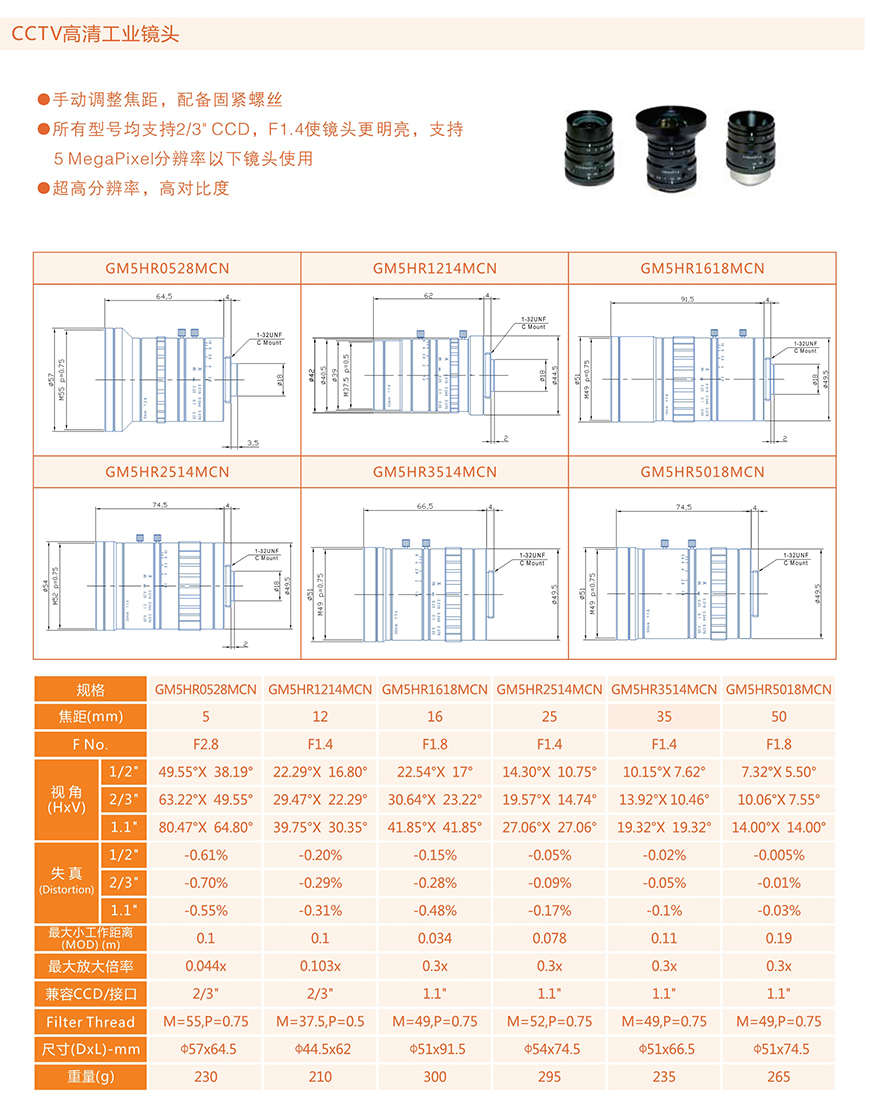 CCTV高清工业镜头手动调整焦距,配备固紧螺丝,所有型号均支持2/3"CCD,F1.4使镜头更明亮,支持5MegaPixel分辨率以下镜头使用,超高分辨率,高对比度。